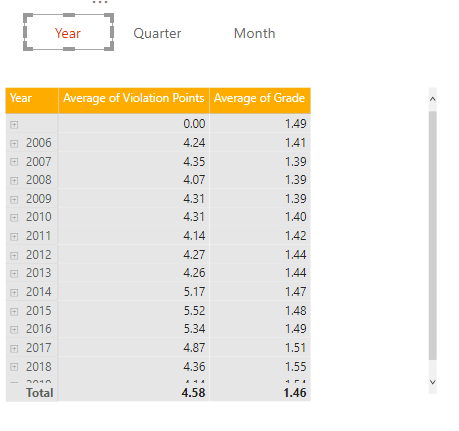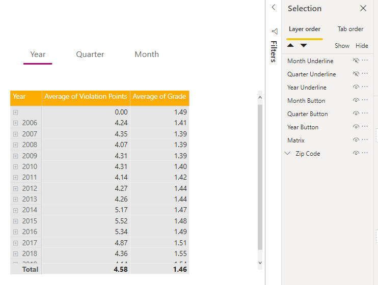 I will start by adding a button for each level that I want to drill down to, giving it a hover color change so it feels interactive. In this case, I have a Matrix with Year, Quarter, and Month as the Row Headers, so I will add a button for each.