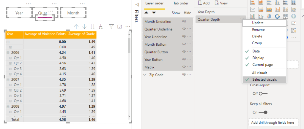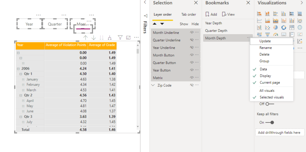 I will now create my Bookmark for the Year depth by selecting the Matrix, and all of my buttons and creating a bookmark that is for Selected Visuals.